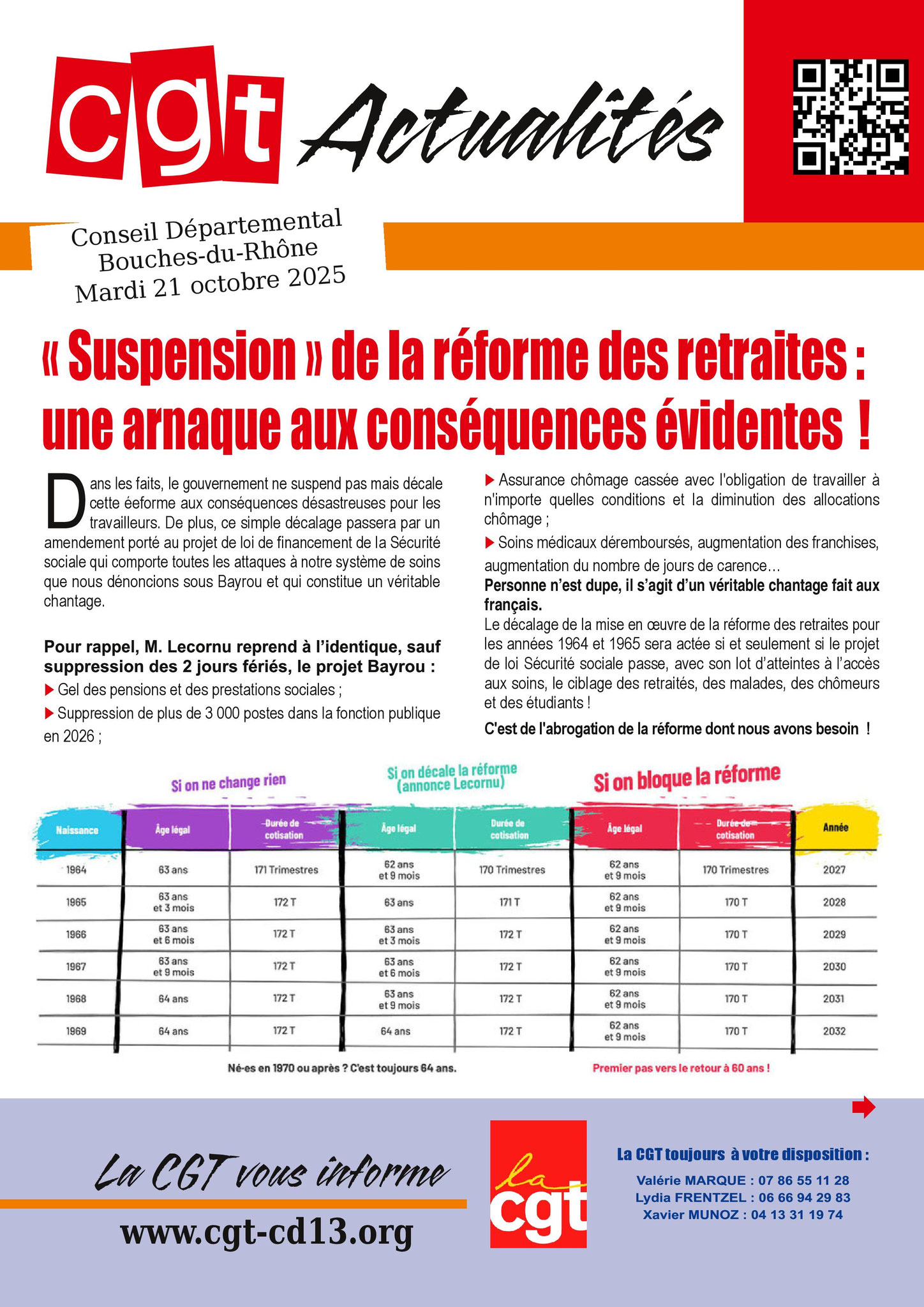 Depuis plusieurs semaines, le gouvernement est confronté à une contestation sociale d'ampleur. Dans les entreprises, les services publics, les lycées et les universités, les salarié·es, les jeunes et les retraité·es se sont massivement mobilisés contre la réforme des retraites et les politiques d’austérité qui frappent le monde du travail. C’est cette mobilisation, déterminée et majoritaire dans le pays, qui a contraint Emmanuel Macron et son gouvernement à annoncer une suspension de la réforme des retraites. Mais l'heure est à la clarté : la suspension annoncée est en réalité un décalage de son application de quelques mois seulement. Ce simple décalage reviendrait à confirmer les 64 ans au mépris de la mobilisation de millions de travailleurs et de travailleuses depuis 2 ans et demi. Pour la CGT, la seule suspension qui vaille est un blocage immédiat de l'application de la réforme des retraites à 62 ans, 9 mois et 170 trimestres.