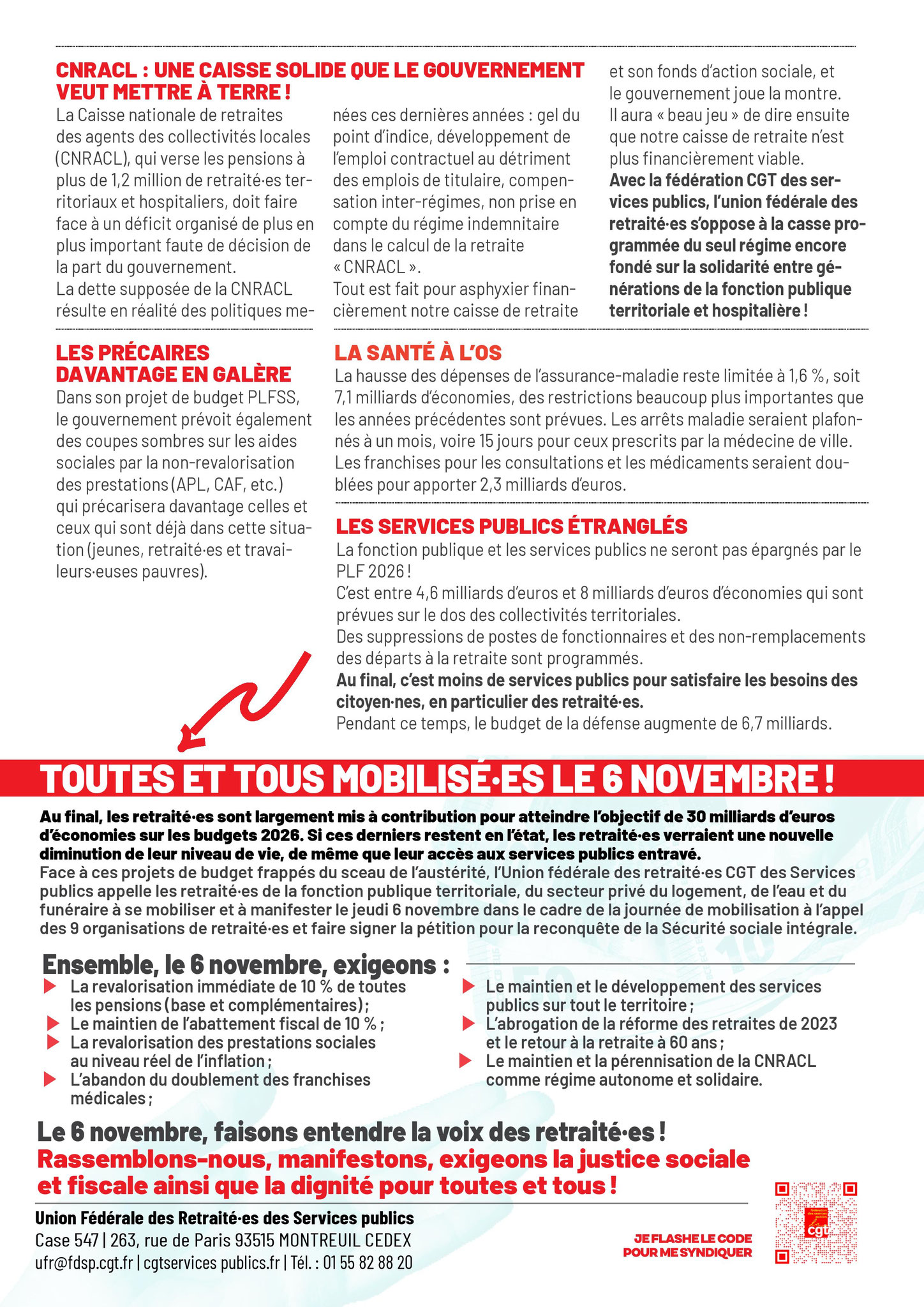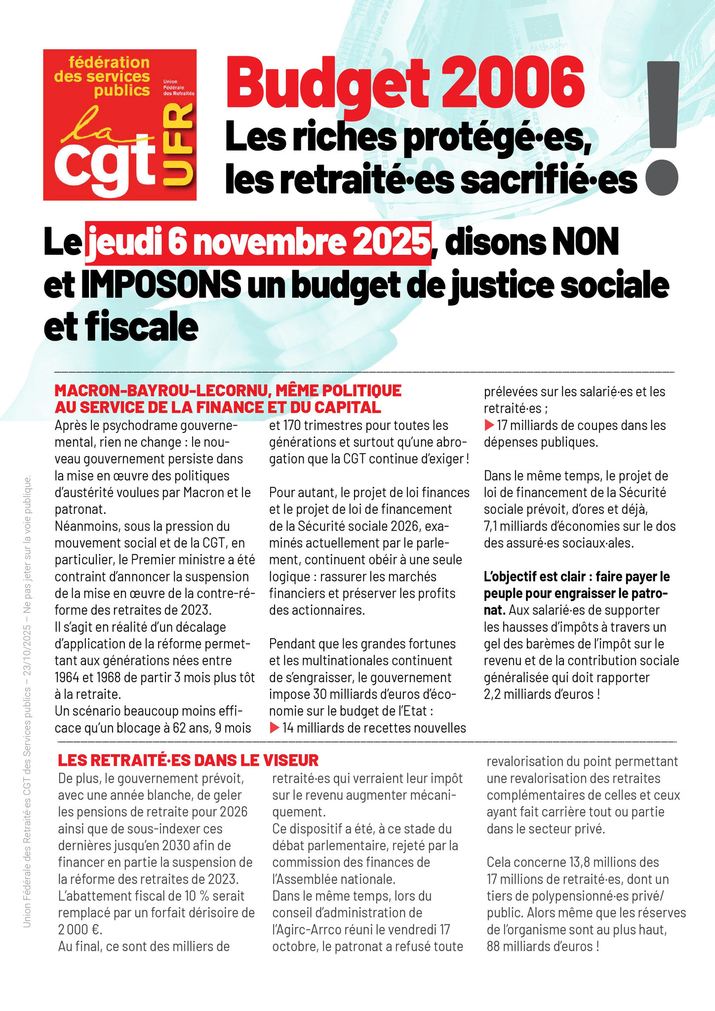 Le Premier ministre, S. Lecornu, lors de sa première nomination, avait déclaré vouloir changer de méthode et laisser la place au dialogue, à la concertation. Son discours de politique générale a, certes, été plus court que ceux de ses prédécesseurs, mais le contenu est toujours aussi violent. Les recettes restent les mêmes pour le projet de budget 2026 : réduire les dépenses de l’État, faire peser les efforts sur les salarié·es, et plus particulièrement sur les retraité·es, et poursuivre les cadeaux au patronat et aux plus riches. Pas de retrait de la réforme des retraites de 2023, mais une suspension jusqu’en janvier 2028, avec un coût estimé de 400 millions d’euros pour 2026 et de 1,8 milliard d’euros pour 2027, qu’il faut donc compenser par des économies pour que la dette ne dépasse pas 4,7% du PIB.