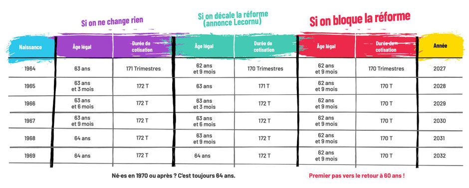 Soutenus seulement par le patronat, ils sont passés en force par 49-3, pour nous voler les 2 meilleures années à la retraite contre l'ensemble des organisations syndicales, contre l'avis de la quasi-totalité de la population, mobilisée en masse. Tous ceux qui ont défendu ce recul social ont subi des défaites électorales. C'est seulement le 5 juin dernier, journée de mobilisation CGT, que l'Assemblée nationale a pu se prononcer pour la première fois, en votant majoritairement une résolution pour l'abrogation. Ces dernières semaines, ce sont nos mobilisations, les 10 et 18 septembre et le 2 octobre, avec 2 millions de grévistes en cumul, qui ont continué de porter la revendication d'abrogation des 64 ans.